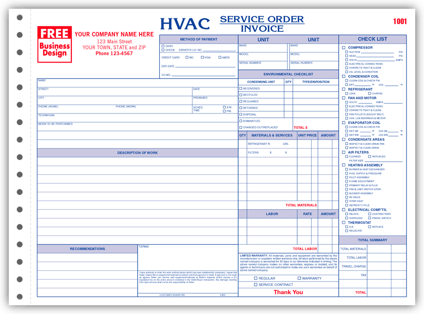 The 6534 HVAC Service Order/Invoice is available in 3 carbonless copies. Your company imprint and logo are ALWAYS FREE! We now have: 301 Piece Starter Kit $114.00 The horizontal format provides enough room for a detailed HVAC Description. Heating & Air Conditioning terms are listed with easy check boxes. |